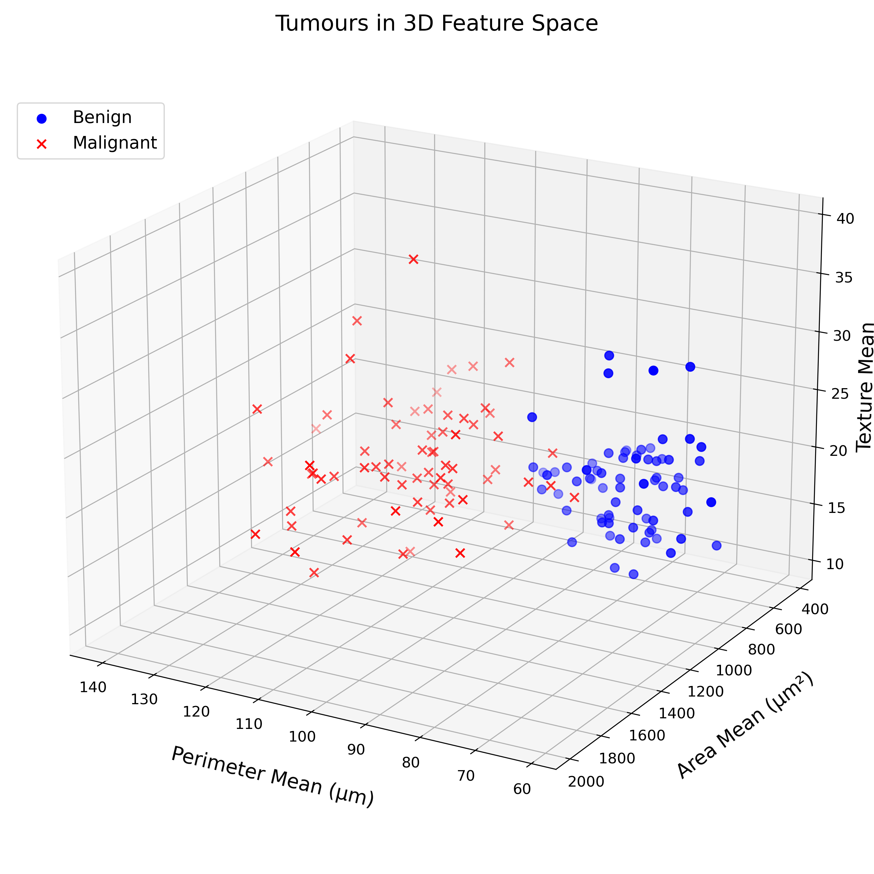 In Mathematics, a list of numbers can represent a point in space. In the example above, each tumour is associated with three numbers. We can use these numbers to represent each tumour as a point in a three-dimensional space.