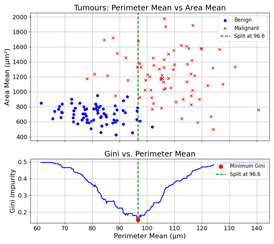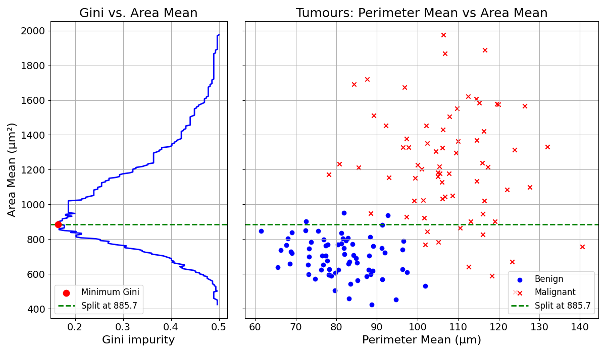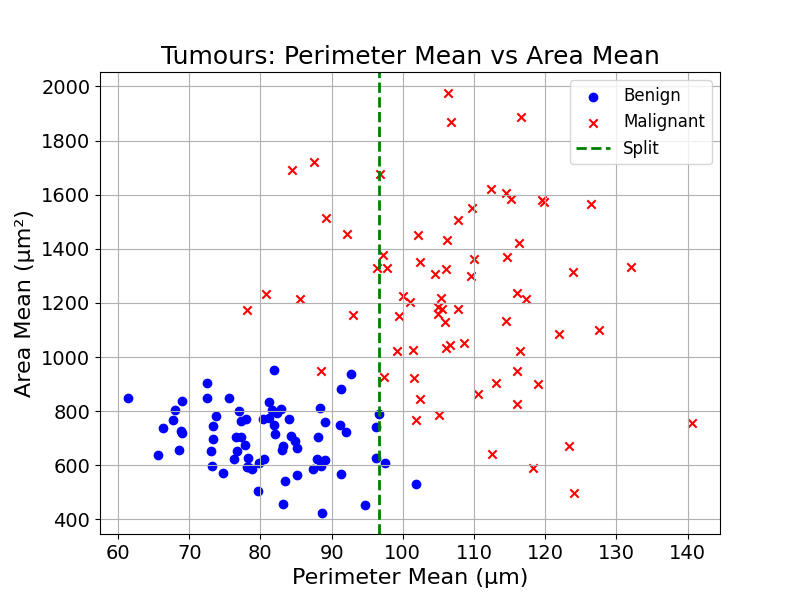 This splitting trial and error can be visualised with the tumour diagnosis dataset: