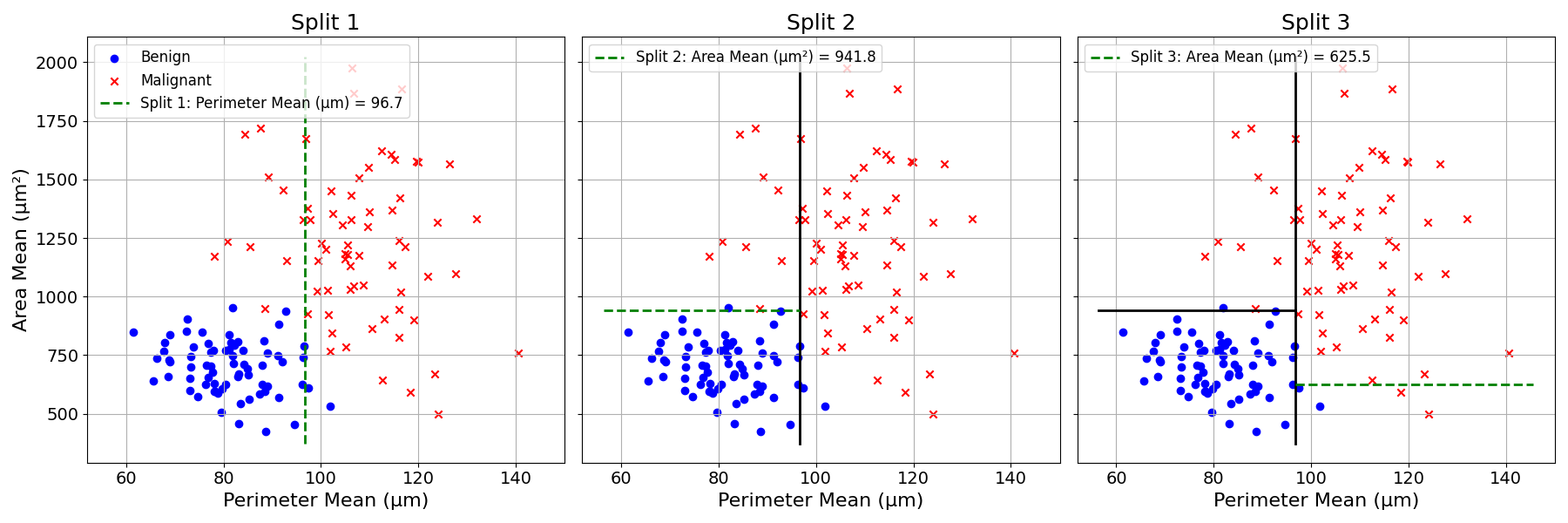 The best split is obtained by splitting the data based on Perimeter Mean at 96.6. This process is repeated every time a group is split.