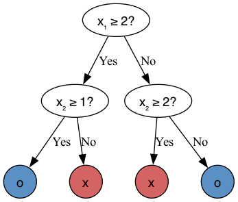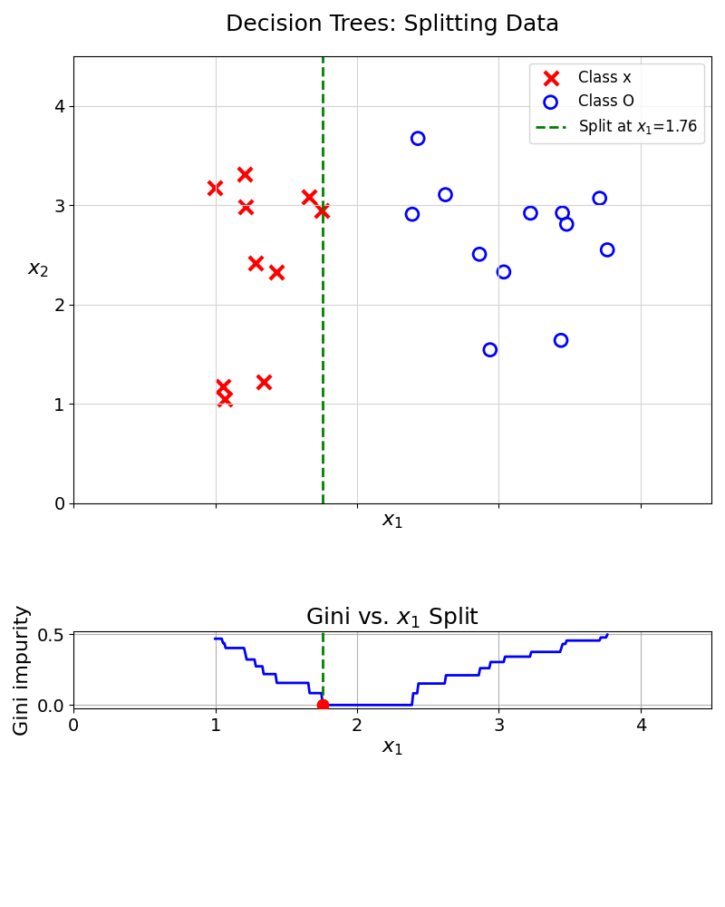 Now that we have a way to measure the quality of a split, we can simply try splitting the data at all feature values for all features, and pick the best one.