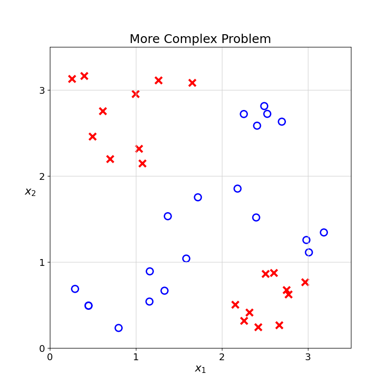 For a more complex case, how would you predict the class of the unknown observation with this training data? How would you split the \(\times\) from the \(\circ\)?