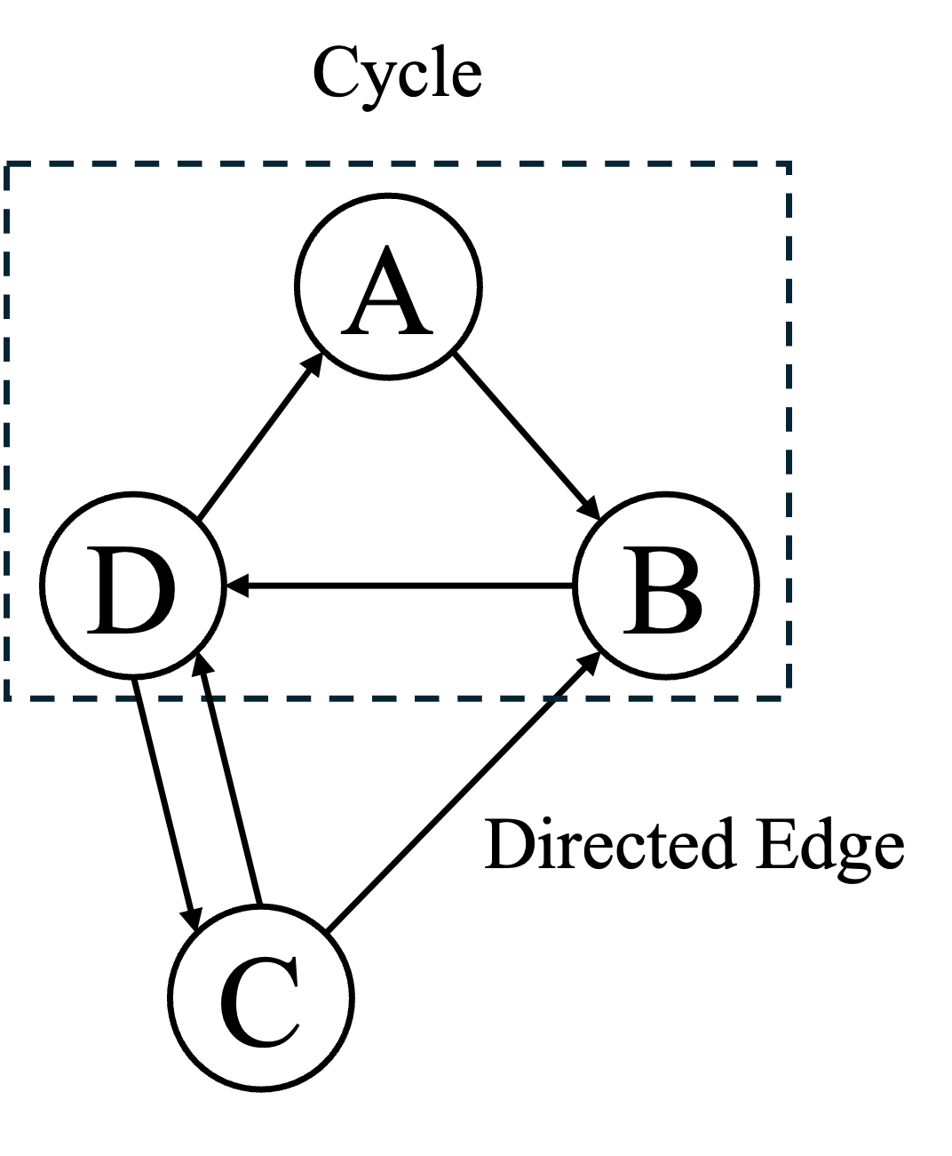 Edges can be directed or undirected. Directed edges can only be traversed in one direction, usually represented as arrows. Edges, i.e., connections between nodes, can form cycles. These cycles are paths that start and end with the same node.