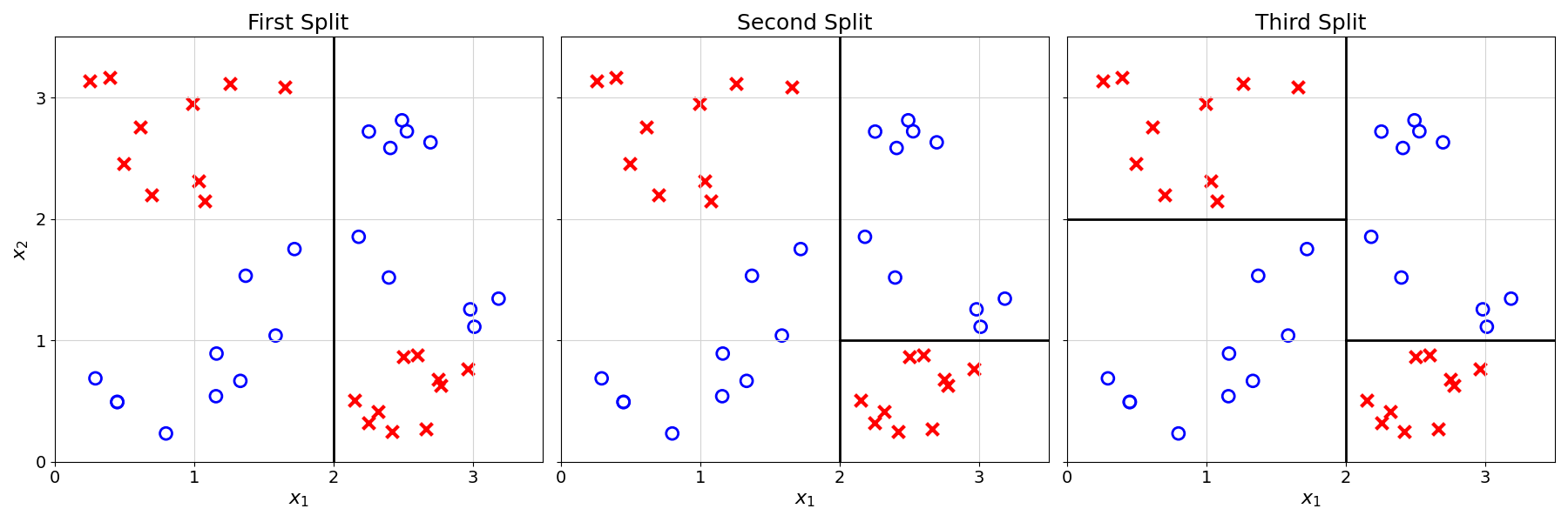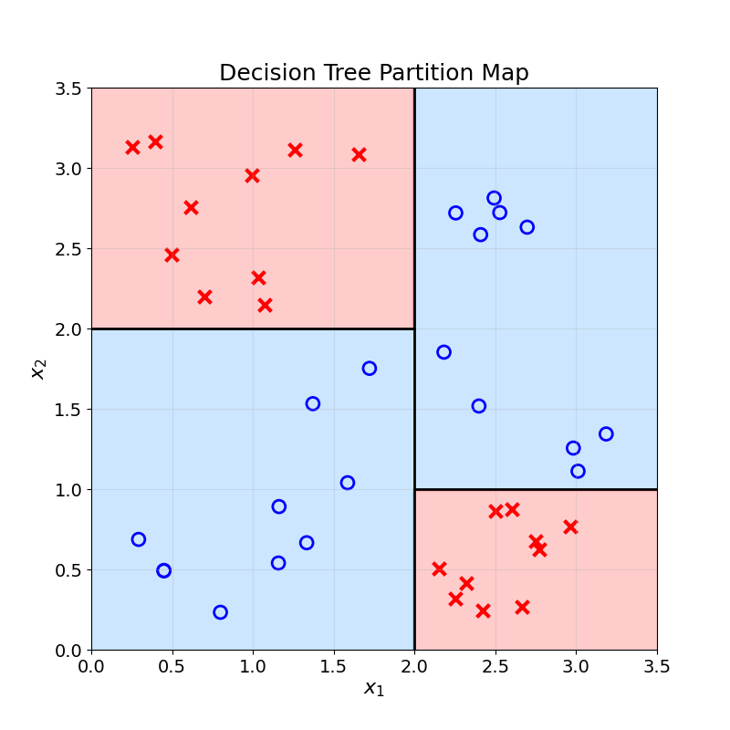 Each split or comparison creates a linear separation in the feature space, represented by a black line in the chart above.