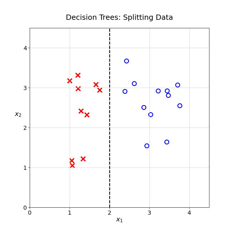 One possibility would be to split the data at \(x_1 = 2\). Any observation with \(x_1\) greater than \(2\) would be classified as \(\circ\); the rest would be classified as \(\times\).