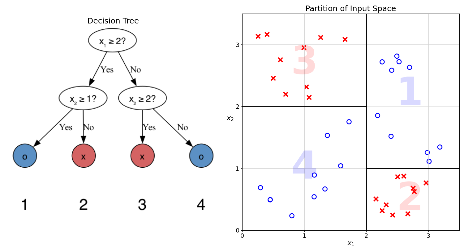 To better understand the relationship between trees and data splits, the tree and the partition can be visualised next to one another: